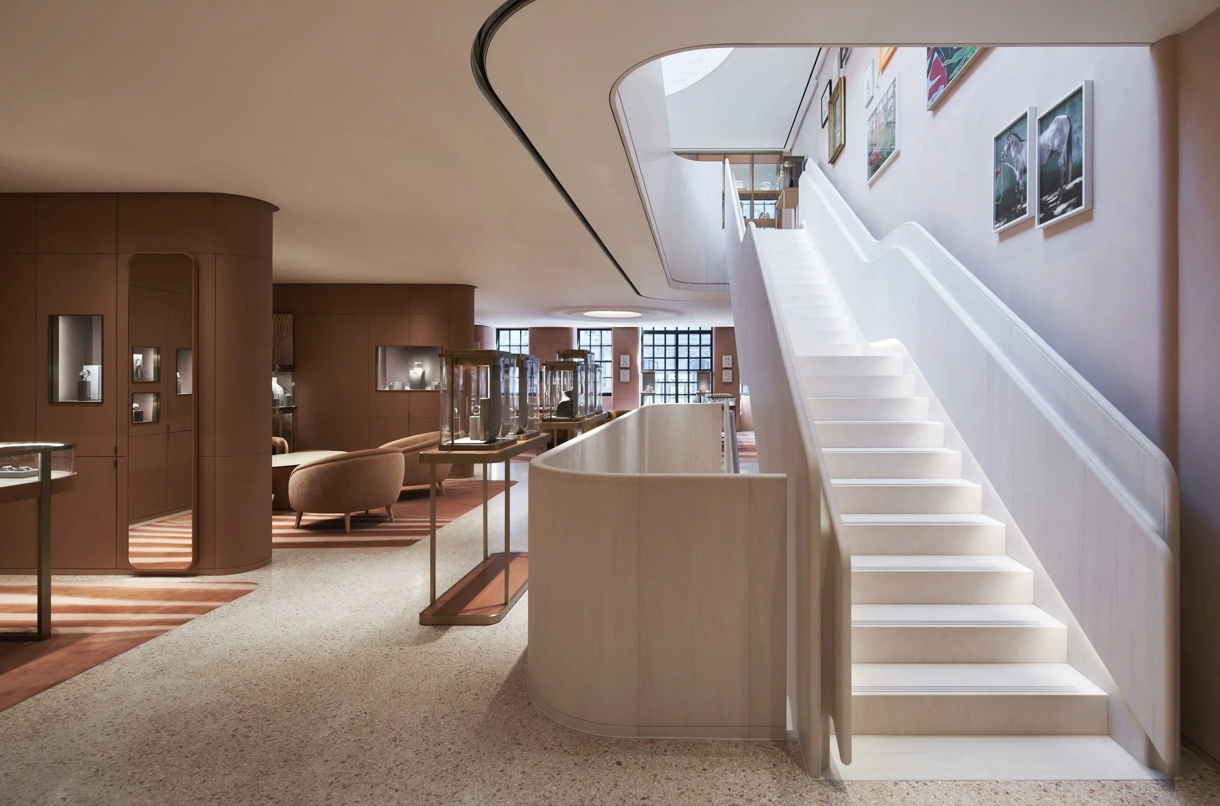 While many jewelry stores in the area embrace a traditional aesthetic, the FoundRae and Spacesmith team opted for a contemporary design with a bold, striking red color palette. Stepping into the new boutique feels like exploring a meticulously curated museum, where each room unveils layers of detail and intimacy.